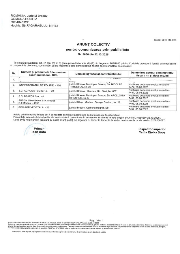 ANUNȚ COLECTIV pentru comunicarea prin publicitate, nr. 9636 din data de 22.10.2025