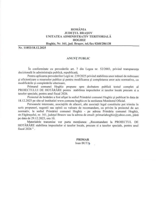 Proiectul de hotarare a fost afisat la sediul Primariei comunei Hoghiz si publicat in data de 18.12.2025 pe site-ul institutiei www.comunahoghiz.ro la sectiunea Monitorul Oficial.