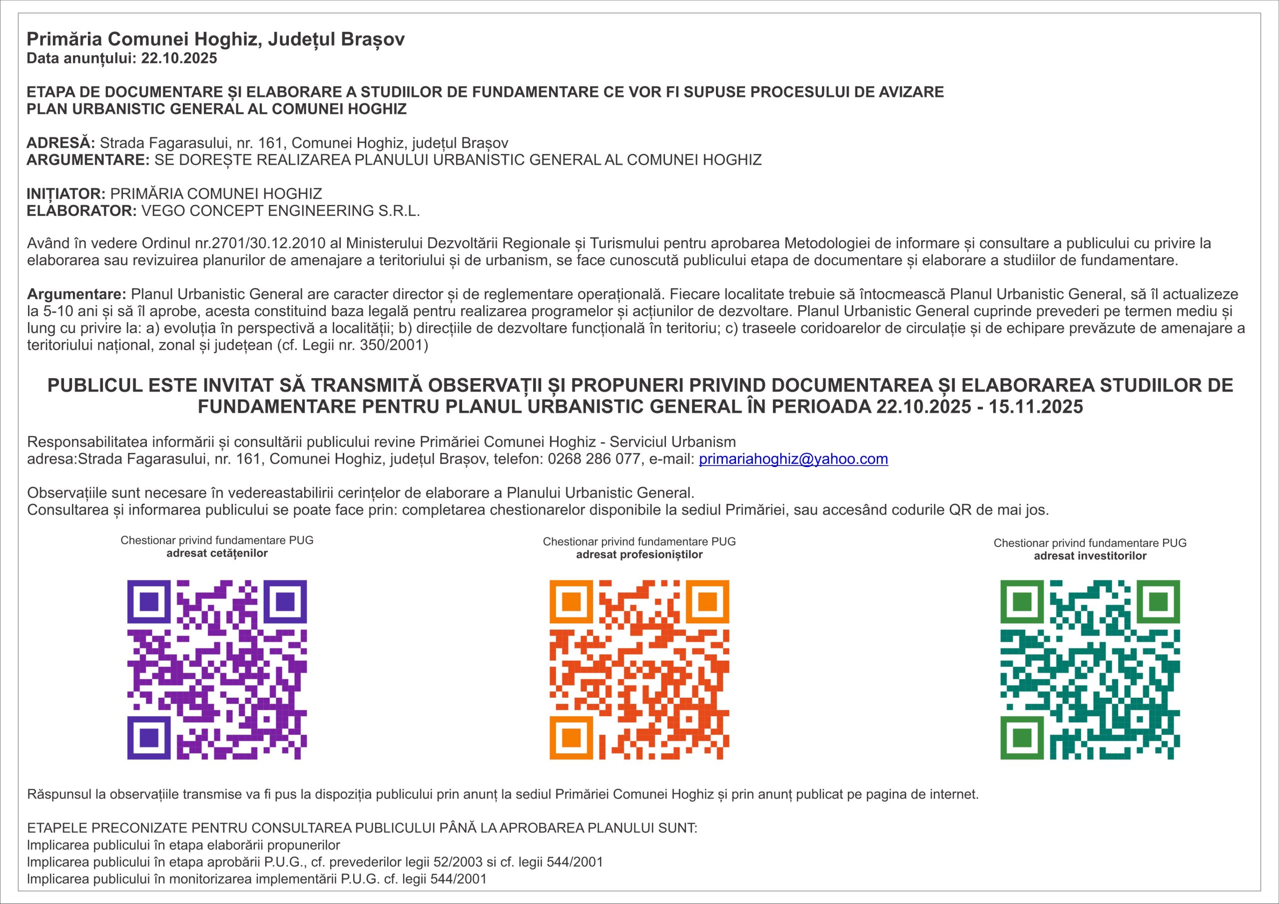 Responsabilitatea informării și consultării publicului revine Primăriei Comunei Hoghiz – Serviciul Urbanism, adresa:Strada Fagarasului, nr. 161, Comunei Hoghiz, județul Brașov, telefon: 0268 286 077, e-mail: primariahoghiz@yahoo.com