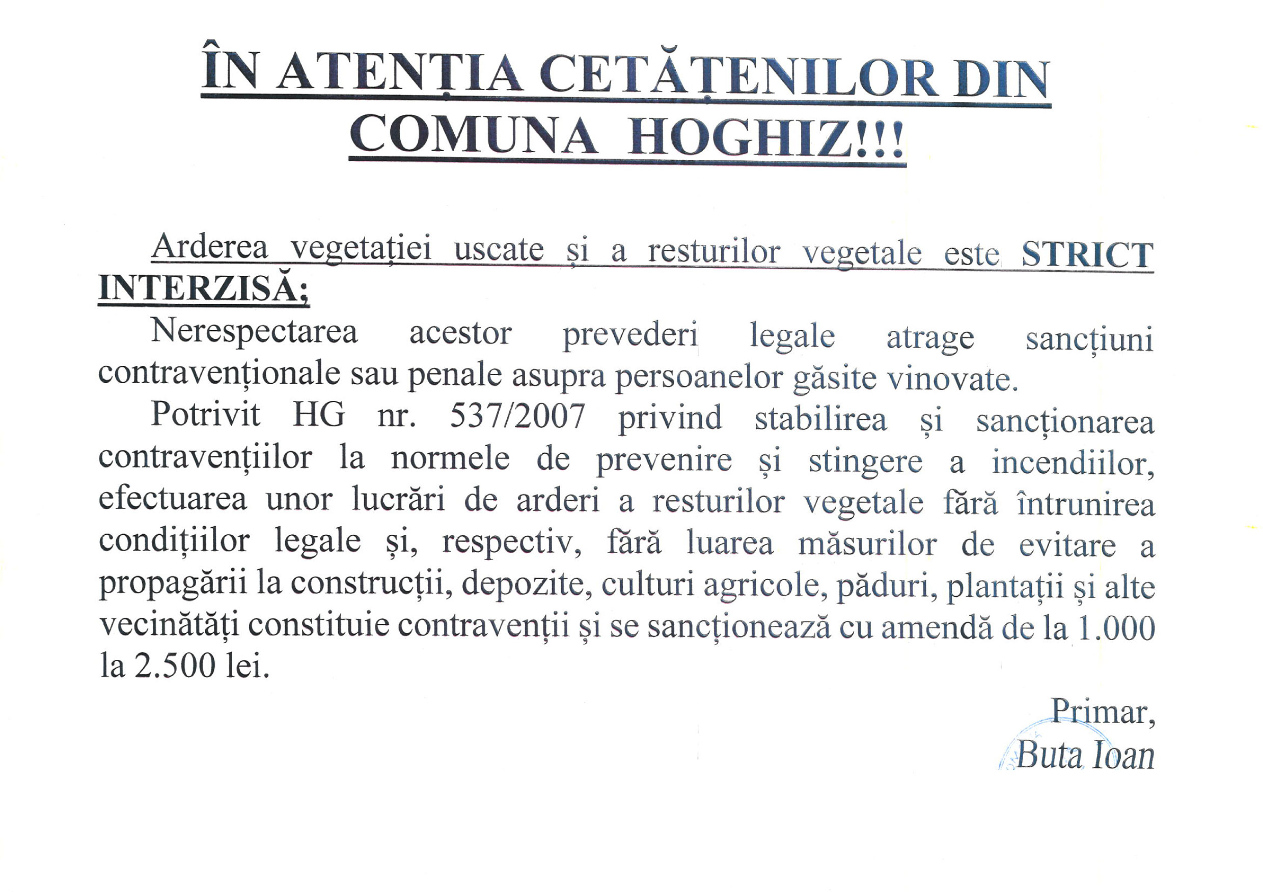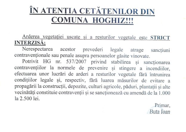 ÎN ATENȚIA CETĂȚENILOR DIN COMUNA HOGHIZ! Arderea vegetației uscate și a resturilor vegetale este STRICT INTERZISĂ.