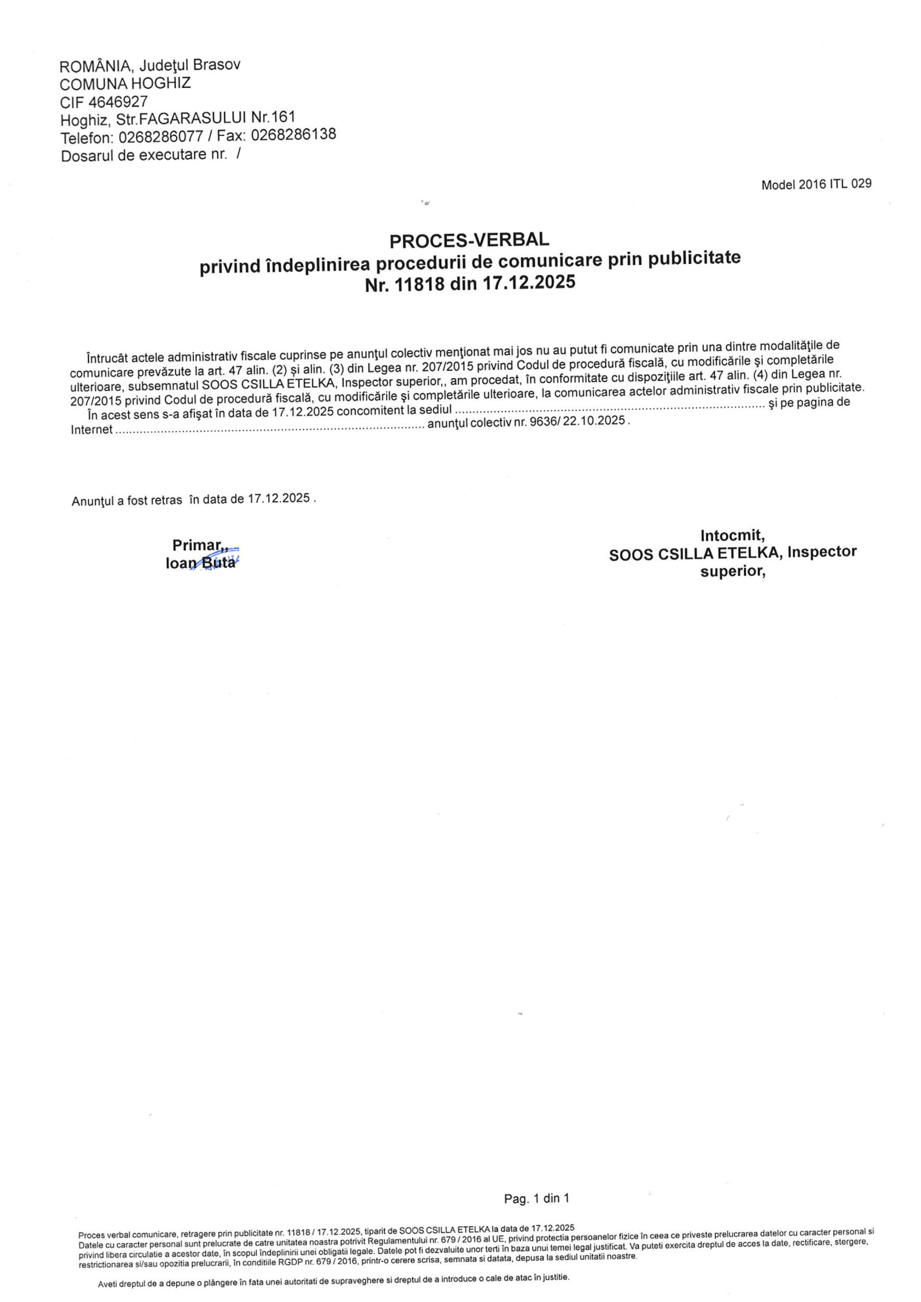 PROCES-VERBAL privind indeplinirea procedurii de comunicare prin publicitate Nr. 11818 din 17.12.2025