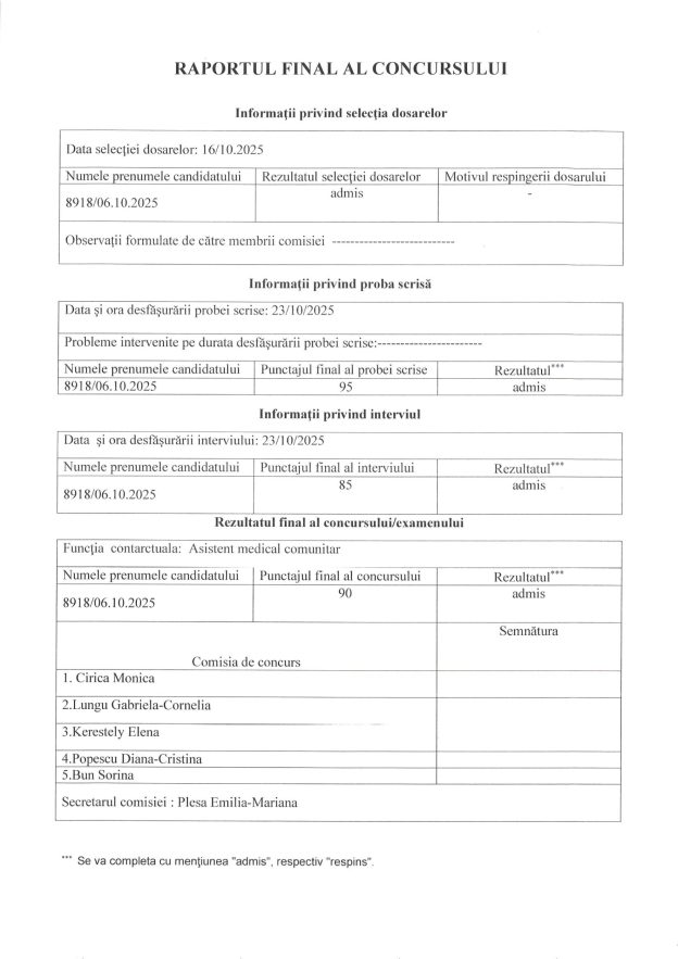 Raport final al concursului de recrutare 1 post de asistent medical comunitar